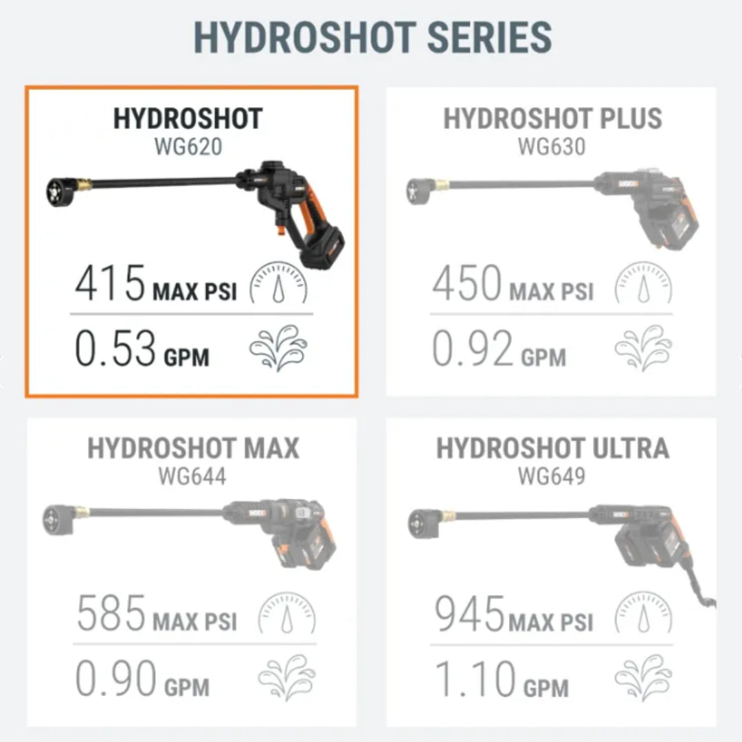 The ultra portable battery-powered Hydroshot delivers just the right amount of cleaning power without causing damage like a standard pressure washer might. With a maximum PSI of 415 and a working PSI of 320, this power washer is great for cleaning window screens, beach gear, grills, outdoor furniture, cars, boats and more. The Hydroshot goes everywhere - simply drop the included draw hose in a body of freshwater or use the bottle connector and bring your own.