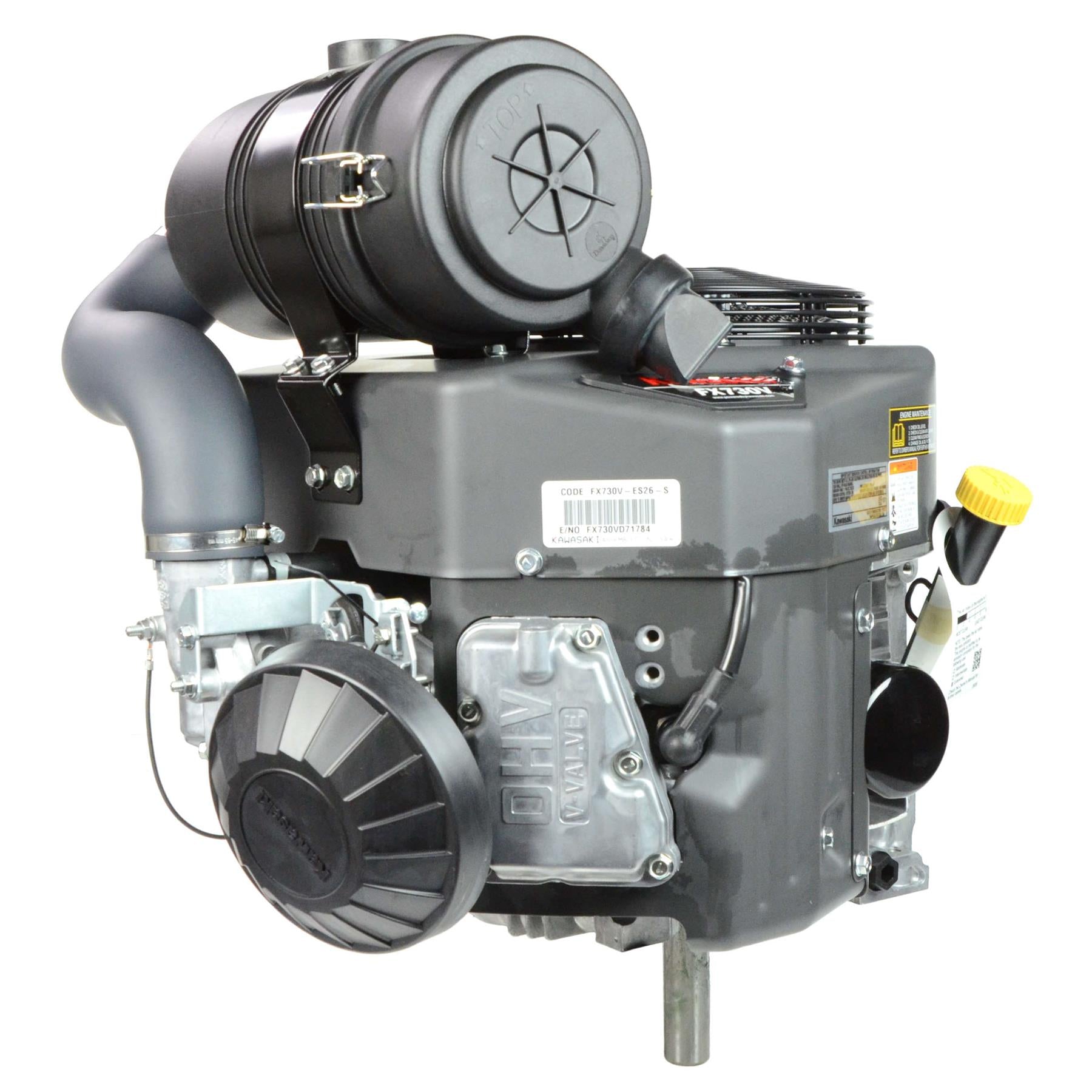 Kawasaki FX730V-S26-S Vertical OHV 4-Cycle Air-Cooled V-Twin Engine, 1-1/8" x 4-9/32" Crankshaft, 726cc, 23.5 HP, Electric Shift Type Start with 15 Amp Charging, Heavy Duty Canister Air Filter w/ Pre-Filter Evap Port, Without Muffler