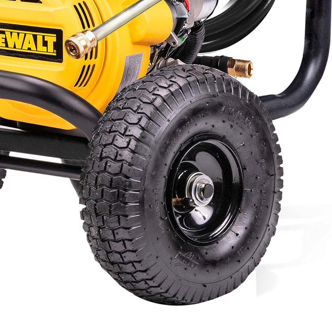 DeWalt's DXPW3300 gas pressure washer is engineered to meet the demands of the cleaning professional. Powered by a DeWalt 208cc engine and an OEM Technologies axial cam pump, this gas pressure washer delivers 3300 PSI at 2.4 GPM. The 25-foot hose is kink and abrasion resistant and features quick connect capability while the matte black frame is powder-coated for corrosion resistance and durability.